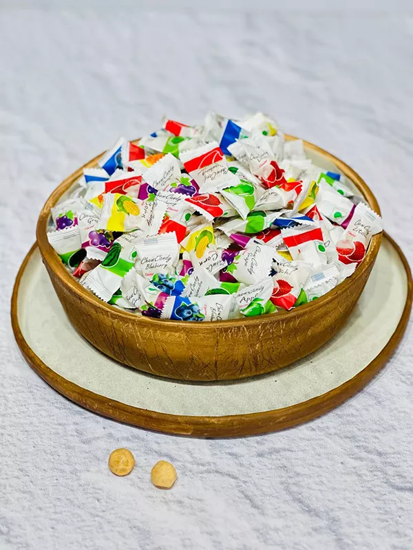 تافی میوهای تایلندی یک نوع شیرینی جویدنی است که با طعمهای مختلف میوه و مغز ژلهای میوه تولید میشود. این تافیها اغلب به صورت گرد و نرم هستند و از مواد اصلی مانند شیر با کیفیت و خامه تغلیظ شده تهیه میشوند. داخل این تافیها با فیلینگ ژلهای میوههایی مانند انبه، هلو، هندوانه، ذرت و بلوبری پر شده است. تنوع در طعم های انبه٫سیب٫آناناس٫انگور٫ذرت٫توت فرنگی٫هندوانه٫بلوبری