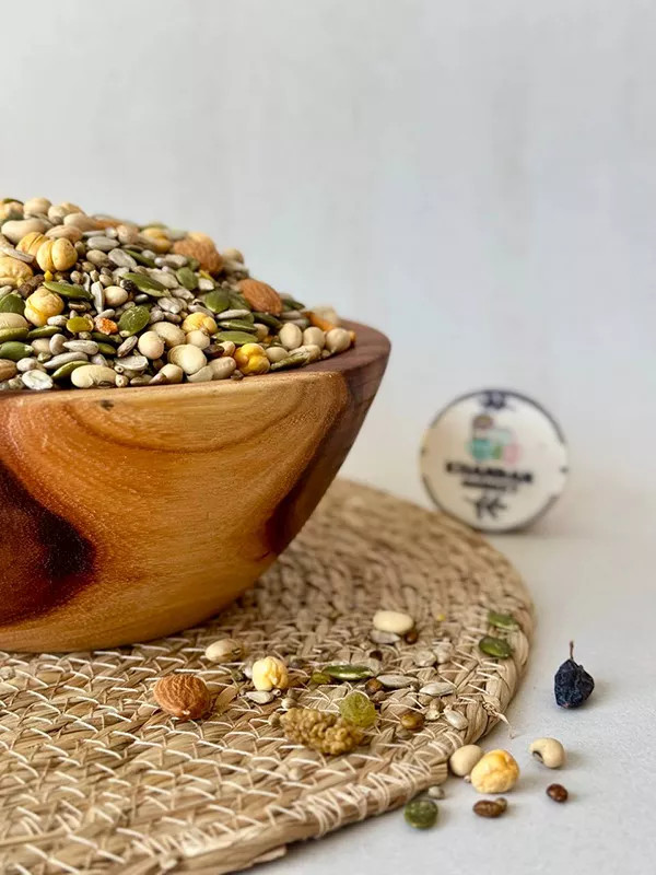 ترکیبات: نخود چی خام، بادام هندی خام، مغز بادام درختی خام، مغز تخمه کدو خام، مویز، آجیل سویا، شاهدانه، مغز تخمه آفتاب گردان خام، توت خشک، کشمش سبز، مغز بنه کوهی