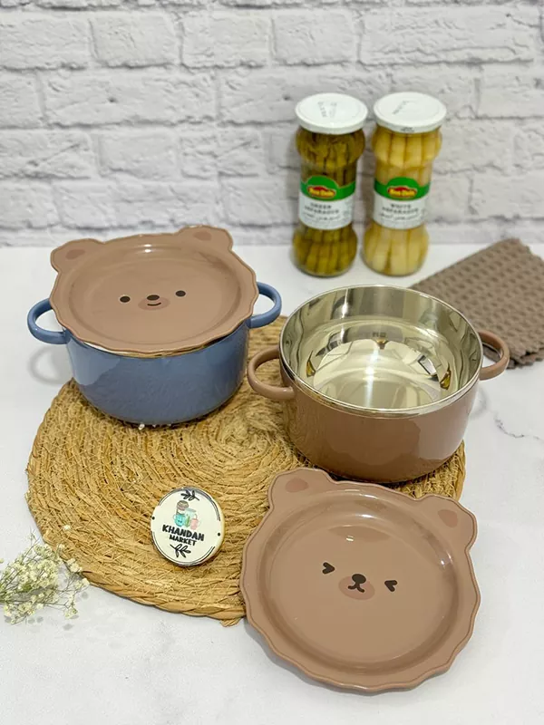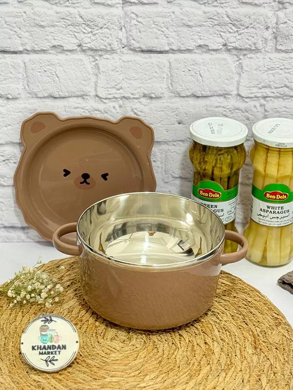 ظرف غذا استیل دوجداره طرح تدی دسته دار دو جداره جداره داخلی استیل دو رنگ( کاسه قهوه ای ،کاسه آبی) قطر دهانه ظرف ۱۵.۵ سانت حجم یک لیتر دور در واشردار از درب به عنوان بشقاب هم می توان استفاده کرد. مناسب برای نگهداری غذا در یخچال وارداتی(چین)