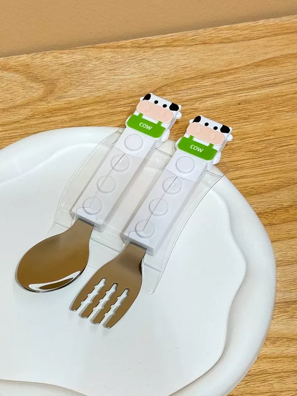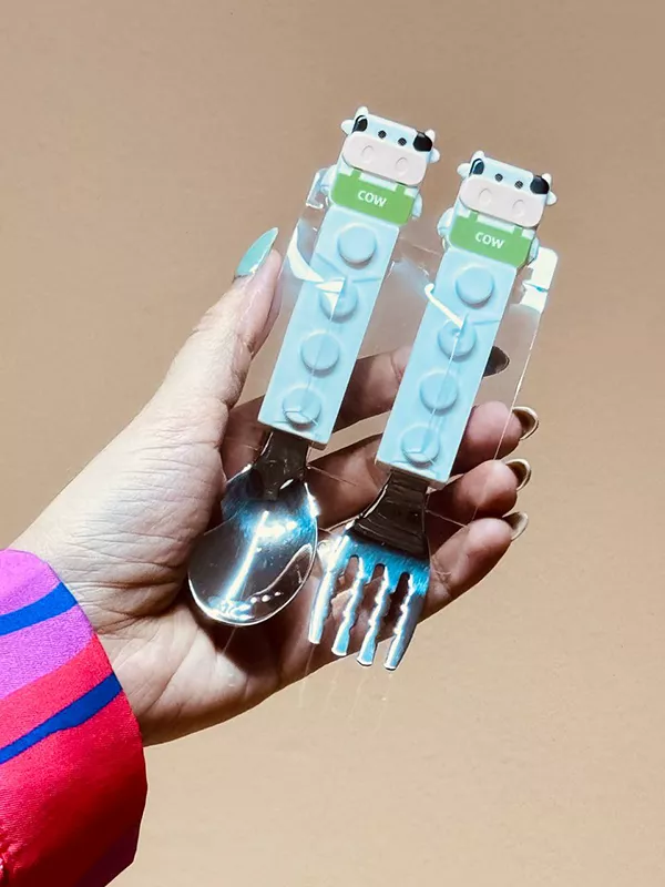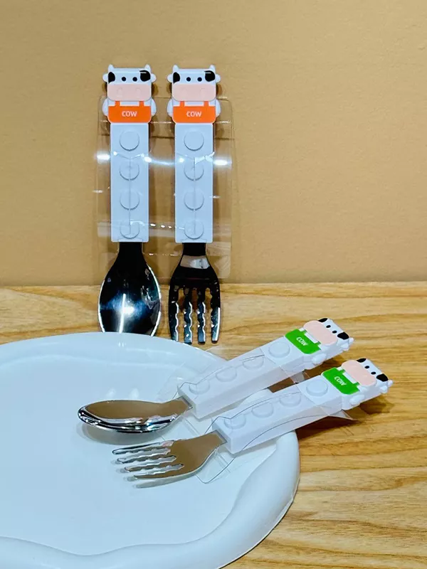 قاشق چنگال فانتزی کودک مدل لگو طرح گاو دسته پلاستیکی اندازه ۱۴ سانت اندازه جعبه ۷*۱۷سانت وارداتی چین موجود در 2 رنگ استیل ۳۰۴