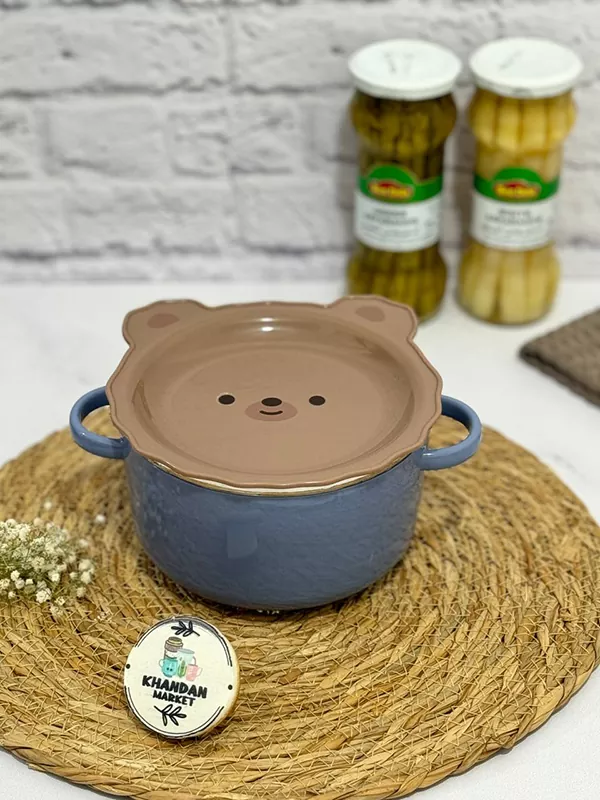 ظرف غذا استیل دوجداره طرح تدی دسته دار دو جداره جداره داخلی استیل دو رنگ( کاسه قهوه ای ،کاسه آبی) قطر دهانه ظرف ۱۵.۵ سانت حجم یک لیتر دور در واشردار از درب به عنوان بشقاب هم می توان استفاده کرد. مناسب برای نگهداری غذا در یخچال وارداتی(چین)